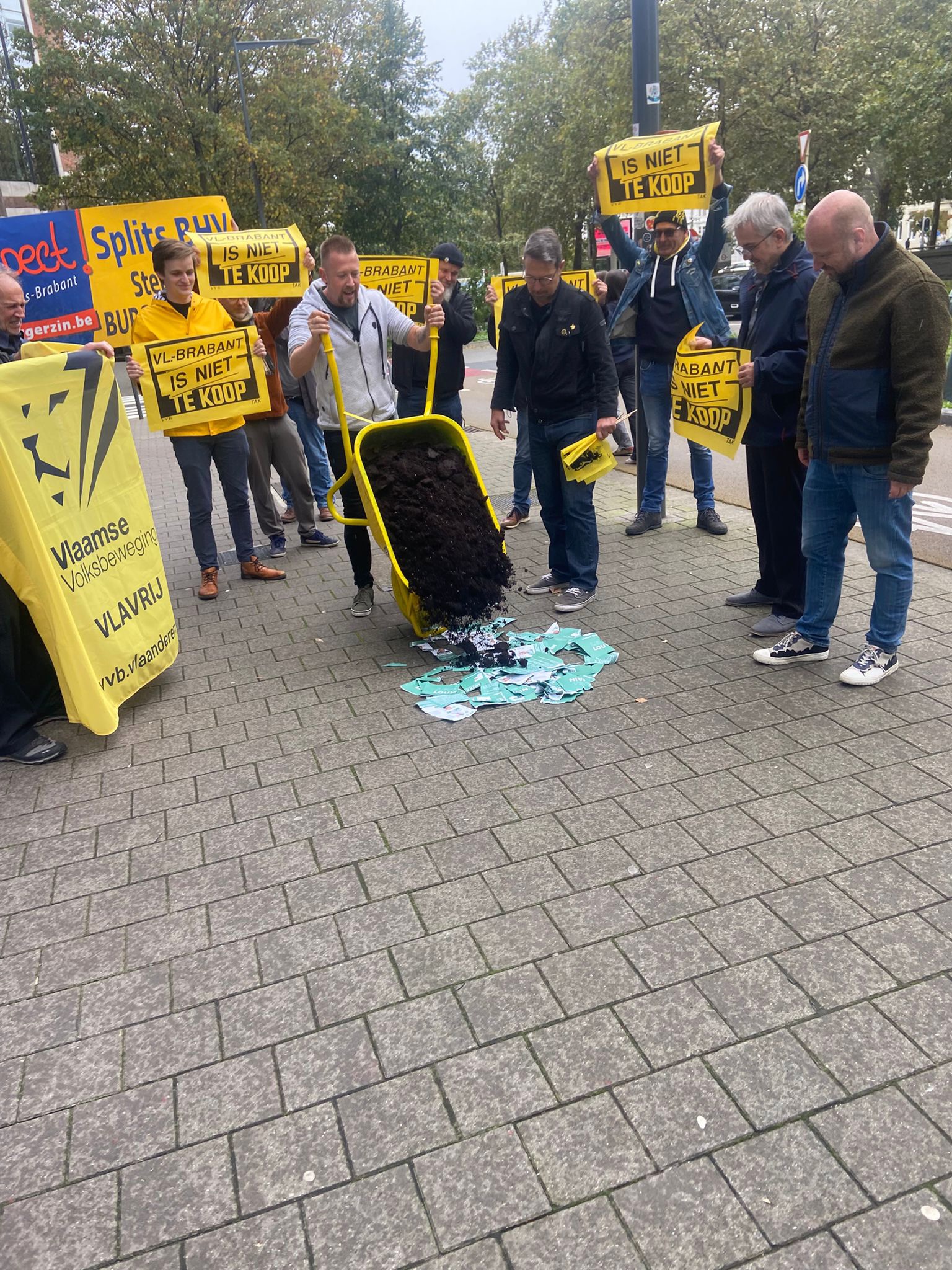 Als direct gevolg kwamen militanten van de Vlaamse Volksbeweging en TAK afgelopen zaterdag samen aan het hoofdkwartier van de MR om er te protesteren tegen het gebrek aan respect voor de Belgische staatsstructuur en taalgebieden. Om onze boodschap kracht bij te zetten, dropten we er symbolisch wat Vlaamse grond en brachten we een aantal UF-folders terug.